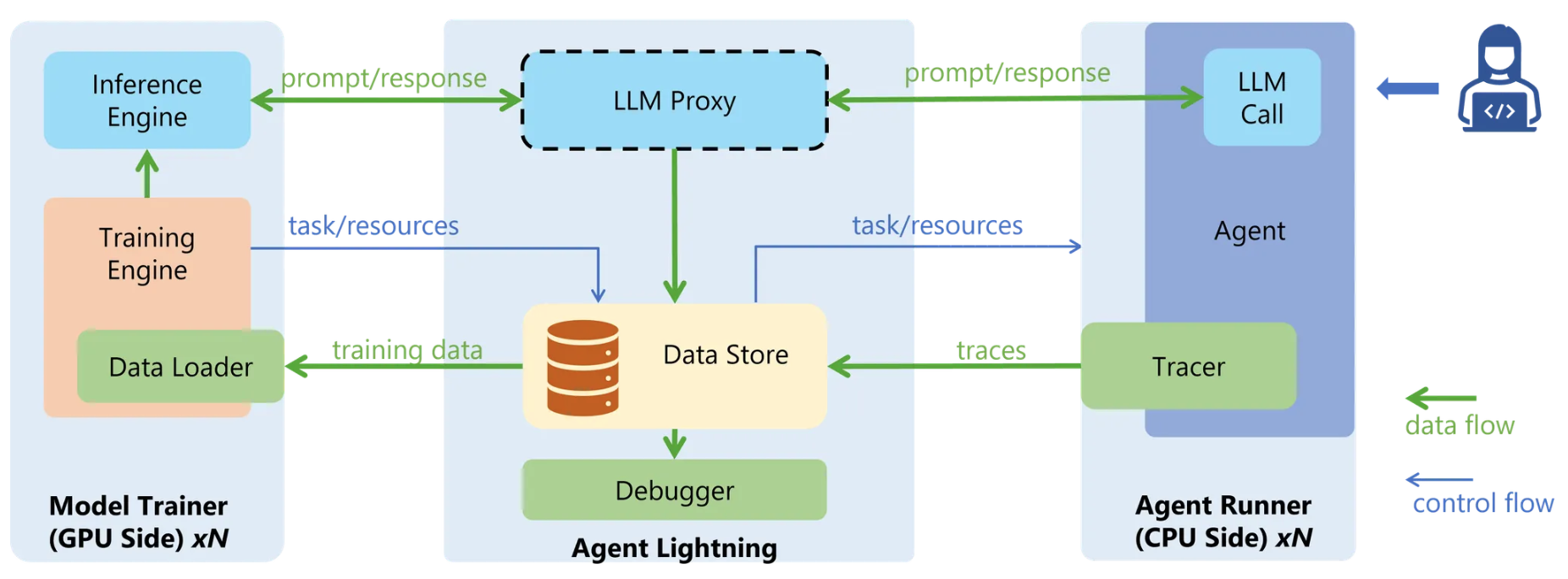 Starting from the perspective of more precise data collection, in v0.2 we have made AGL’s role in agent optimization more clear. Conceptually, Agent Lightning, or AGL, introduces a sustainable middleware layer and standardized data protocols for agent optimization, especially agent RL.