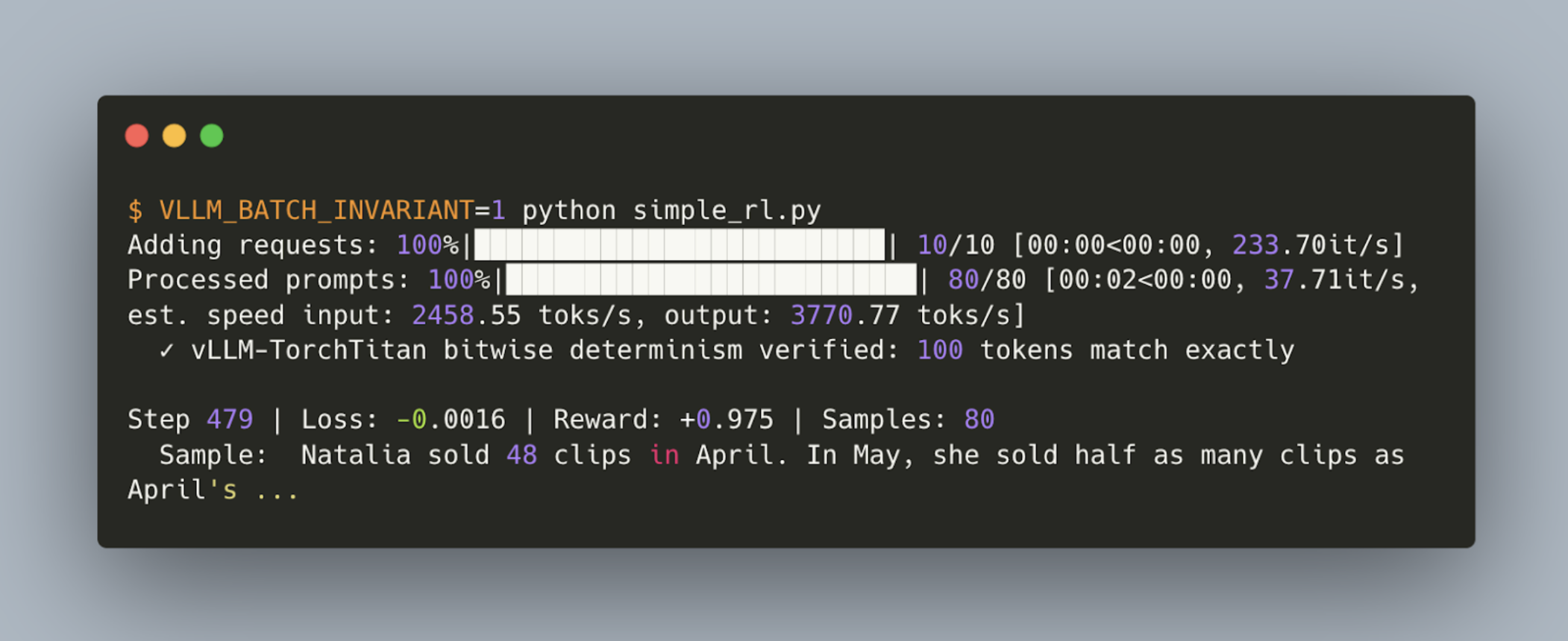 RL Performance Our current results show that the bitwise RL run is 2.4x slower than the non-bitwise case. We will continue to improve the performance of vLLM with better tuning of batch-invariant kernels, as well as levereaging technologies including compilation.